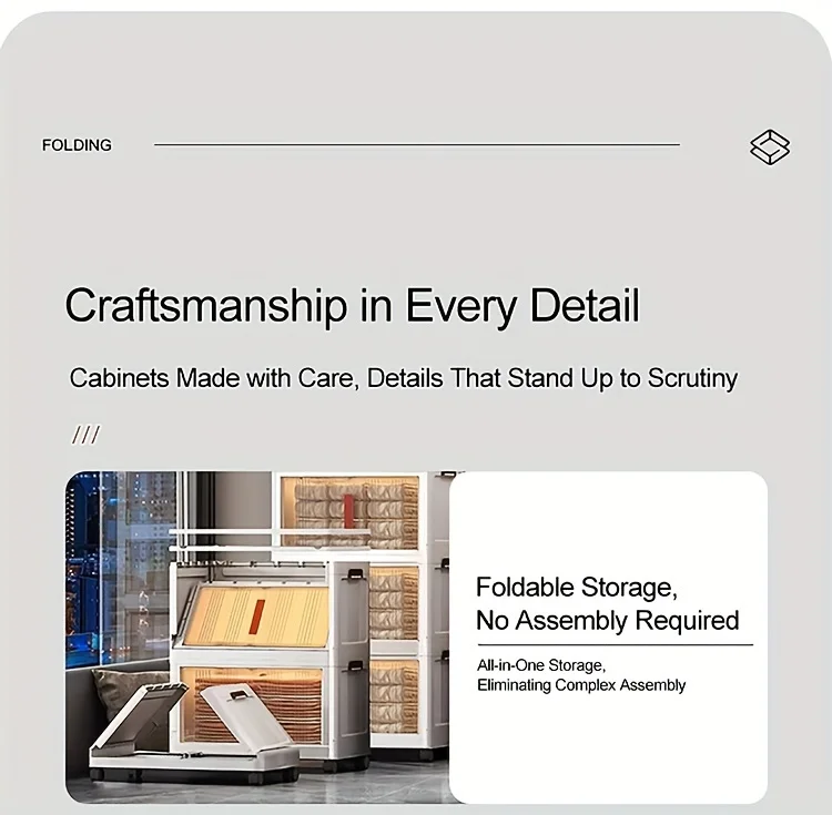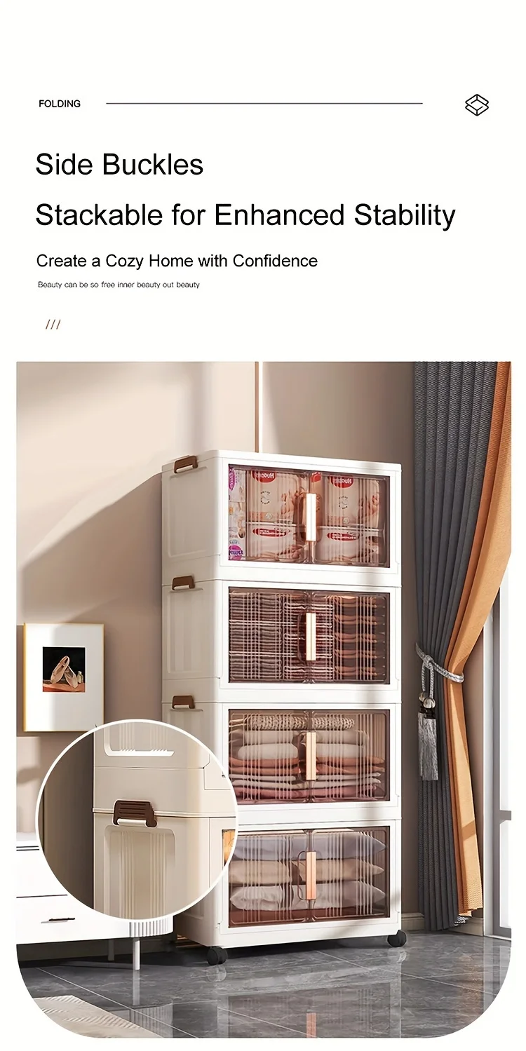 Unique Attributes: Transparent and Magnetic Doors, Made from High-Quality Durable Material, Simple Installation, Enhances Vertical Storage Capacity, Ideal for Compact Spaces, 360° Rotating and Lockable Wheels, Stackable and Foldable Storage Containers with a Single Lid on Top